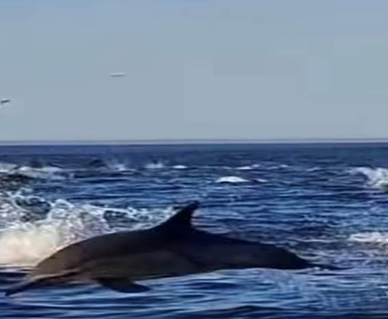 Fotograma del film de cardumen de delfines sobre la costa argentina de Necochea obtenida el 27 de Agosto de 2025 donde se puede apreciar en el margen superior izquierda un posible TicTac